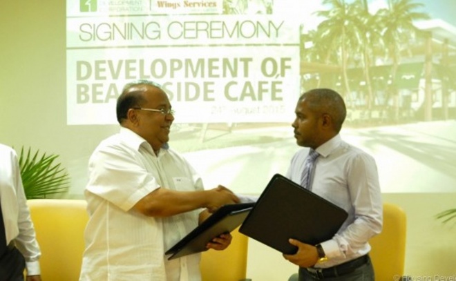 ކެފޭ ހެދުމަށް ބިންދޫކުރި އެއްބަސްވުމުގައު ހައުސިން ޑިވެލޮޕްމެންޓް ކޯޕަރޭޝަން(އެޗްޑީސީ)ގެ ފަރާތުން ސޮއިކުރެއްވީ އެކުންފުނީގެ މެނޭޖިން ޑިރެކްޓަރު މުހައްމަދު ސައިމަންއެވެ. ބިން ލިބުނު ވިންގްސް ސާވިސްގެ ފަރާތުން ސޮއިކުރެއްވީ އެކުންފުނީގެ މެނޭޖިން ޑިރެކްޓަރު ހަސަން ބާގިރުއެވެ.