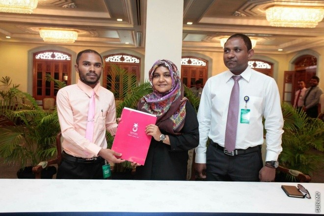 ގއ. ކޮލަމާފުށިން މިއަދު ޕީޕީއެމްއާ ގުޅުނު ބައެއް މެންބަރުންނާއެކު މެޑަމް ފާތުން އާއި ގއ. ވިލިނގިލި ދާއިރާގެ މަޖިލިސް މެންބަރު ސައުދު ހުސައިން -- ސަން ފޮޓޯ: ޝުއާއުﷲ