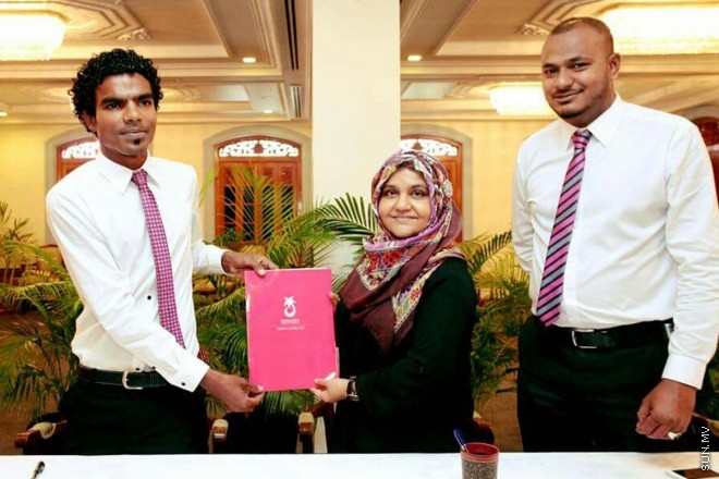 ހއ. ބާރަށު ކައުންސިލްގެ މެންބަރު އަބްދުﷲ ޒުނައިން މެޑަމް ފާތުންއާ މެމްބަރޝިޕް ފޯމް ހަވާލުކުރައްވަނީ. އަރިހުގައި ބާރަށު ދާއިރާގެ މެންބަރު އިބްރާހީމް ޝުޖާއު -- ސަން ފޮޓޯ: ޝުއާއުﷲ