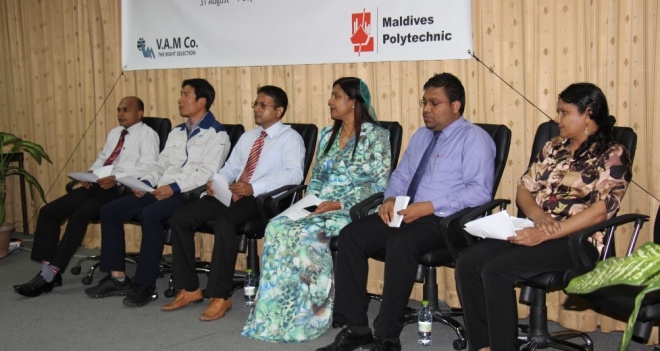 މޯލްޑިވްސް ޕޮލިޓެކްނިކްގައި މިއަދު ފެށުނު "ދޫސަން މެރިން އިންޖީން ޓްރެއިނިންގ" ތަމްރީން ޕްރޮގްރާމް ފެށުމުގެ ރަސްމިއްޔާތުގެ ތެރޭން -- ފޮޓޯ: އެޑިއުކޭޝަން މިނިސްޓްރީ