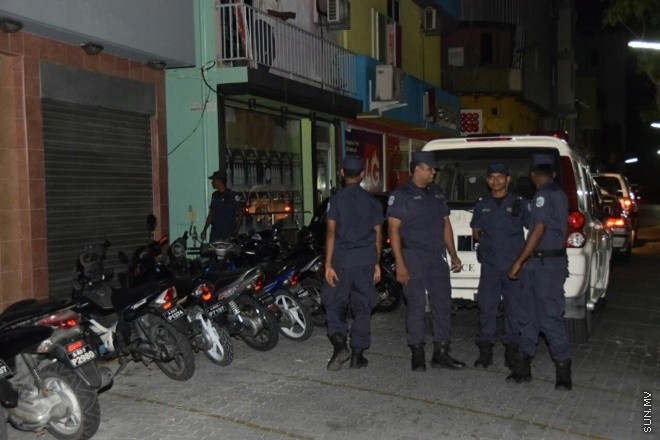 ޝަހީދު އަލީ މިސްކިތް ކުރިމަތީގައި ހުރި ގެއެއް ކޯޓު އަމުރެއްގެ ދަށުން ފުލުހުން ބަލައި ފާސްކުރާއިރު، އެގޭގެ ބޭރުގައި ފުލުހުން ހަރަކާތްތެރިވަނީ --- ސަން ފޮޓޯ: ޔޫސުފް ސޮފްވާން