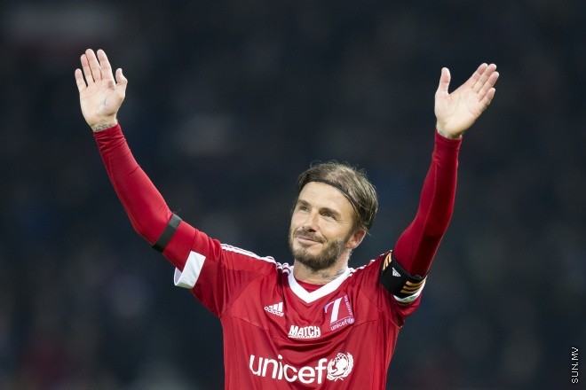 ރޭގެ މެޗްގައި ބެކަމް ސަޕޯޓާރުންނަށް އިޝާރަތްކޮށް ޝުކުރު އަދާކުރަނީ --- ފޮޓޯ:އޭޕީ