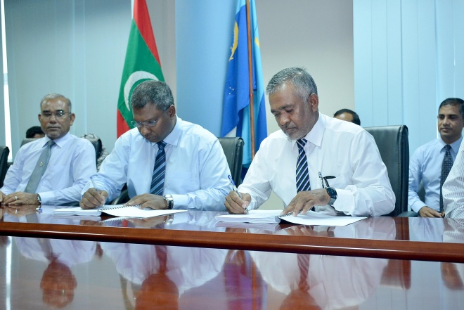 އުލިގަމުގައި އޮފީހެއް އިމާރާތްކުރުމުގެ އެއްބަސްވުމުގައި ސޮއިކުރައްވަނީ. ސަން ފޮޓޯ: ޢަލީ ނަސީރު