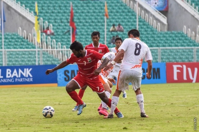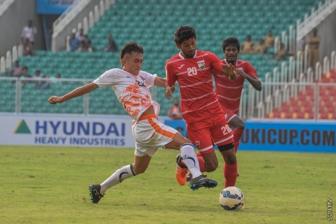ޑިސެމްބަރު، 24، 2015: އިންޑިއާގެ ޓްރިވެންޑްރަމްގައި ކުރިއަށްދާ ސާފް ސުޒުކީ ކަޕުގައި ބޫޓާނާ ދެކޮޅަށް ދިވެހި ރާއްޖެ ކުޅުނު މެޗުގެ ތެރެއިން-- ސަން ފޮޓޯ/ ފަޔާޒު މޫސާ