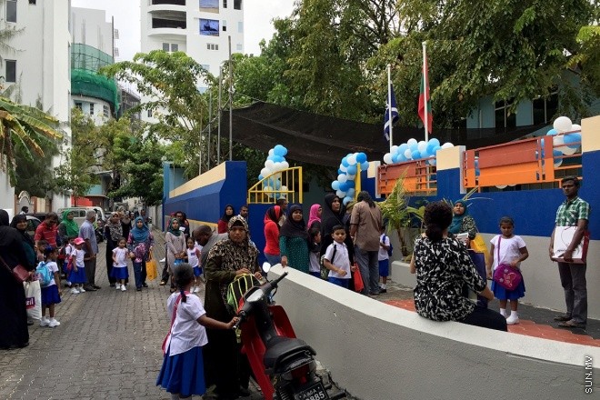 އަމީރު އަހްމަދު ޕްރީ ސްކޫލްގެ ދަރިވަރުން ގޮވައިގެން ބެލެނިވެރިން ހެނދުނު އެ ސްކޫލް ކައިރީ-- ސަން ފޮޓޯ: އަހްމަދު މުޖްތަބާ
