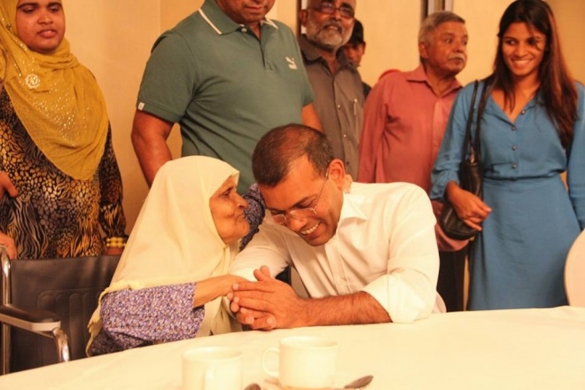 މައިބަދައިގެ އޮޕަރޭޝަން ކުރެއްވުމަށް ޔޫކޭއަށް ވަޑައިގަތުމުގެ ކުރިން ރައީސް ނަޝީދު، ލަންކާގައި ދިރިއުޅޭ ބައެއް ދިވެހީންނާ ބައްދަލުކުރެއްވުމަށް ބޭއްވި ހަފްލާގެ ތެރެއިން -- ފޮޓޯ: އެމްޑީޕީ