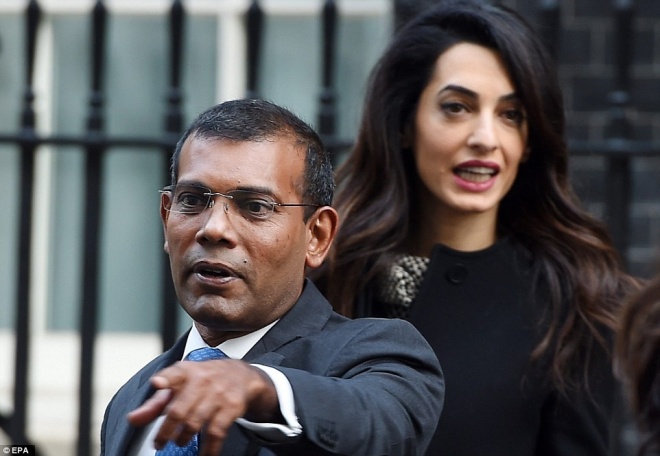 ކުރީގެ ރައީސް މުޙައްމަދު ނަޝީދާއި އެމަނިކުފާނުގެ ވަކީލު އާމާލް ކްލޫނީ ޑައުނިން ސްޓްރީޓް ނަމްބަރ10 ގެ ބޭރުގައި. ފޮޓޯ: ޑެއިލީ މެއިލް