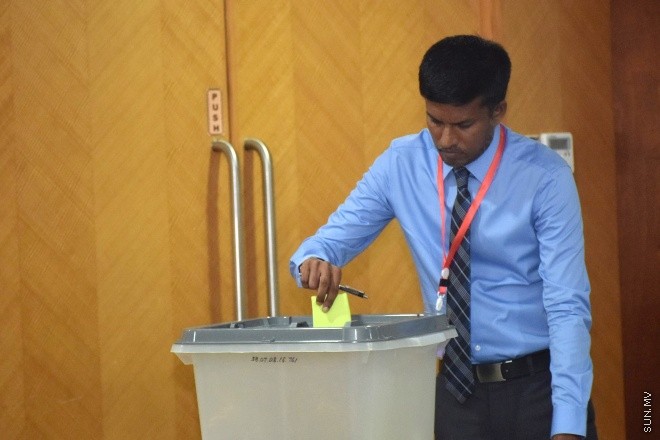 ވީއޭއެމްގެ ރައީސަކު ހޮވުމަށް ބޭއްވި އިންތިހާބްގައި ރިޔާ ވޯޓް ލައްވަނީ --- ސަން ފޮޓޯ: ފަޔާޒު މޫސާ