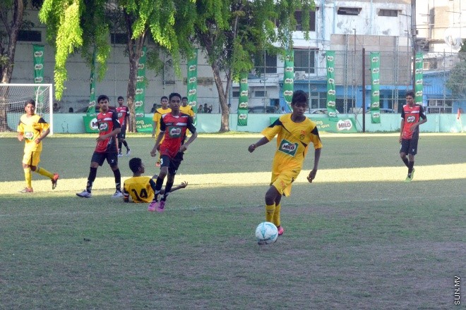މައިލޯ އިންޓަ ސްކޫލް ފުޓްބޯޅަ މުބާރާތުގެ 16 އަހަރުން ދަށުގައި އިއްޔެ ތާޖުއްދީން ސްކޫލް އާއި ޣާޒީ ސްކޫލު ކުޅުނު މެޗުގެ ތެރެއިން --- ސަން ފޮޓޯ: މުއާވިއަތު އަންވަރު
