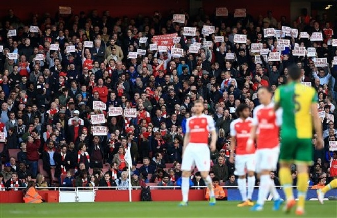 އާސެނަލް ނޯވިޗް އަތުން 1-0 އިން މޮޅުވި މެޗުގައި އާސެނަލްގެ ސަޕޯޓަރުން އެ ޓީމު ބަދަލަކަށް ބޭނުންވާ ކަމަށް ގޮވާލައި އިހްތިޖާޖުކުރަނީ -- ފޮޓޯ: އޭޕީ