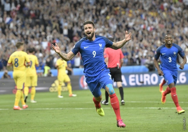 ޔޫރޯ 2016: ރުމޭނިއާ ކޮޅަށް ލަނޑު ޖެހުމަށްފަހު އޮލިވަ ޖިރޫ އުފާފާޅުކުރަނީ. ރޫމެނިއާ އަތުން މިރޭ ފްރާންސް މޮޅުވީ 2-1 ލަނޑުން-- ފޮޓޯ: އޭޕީ