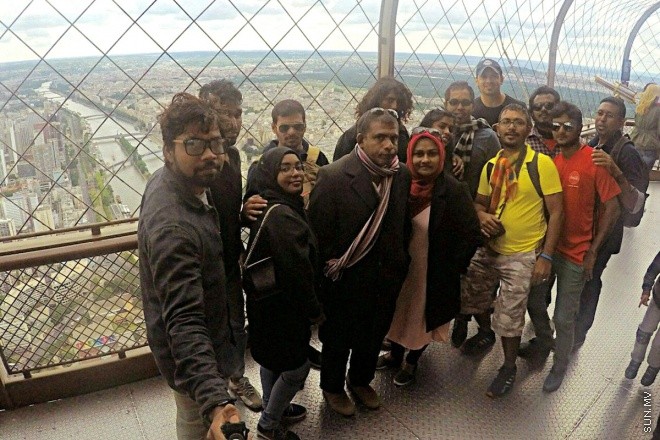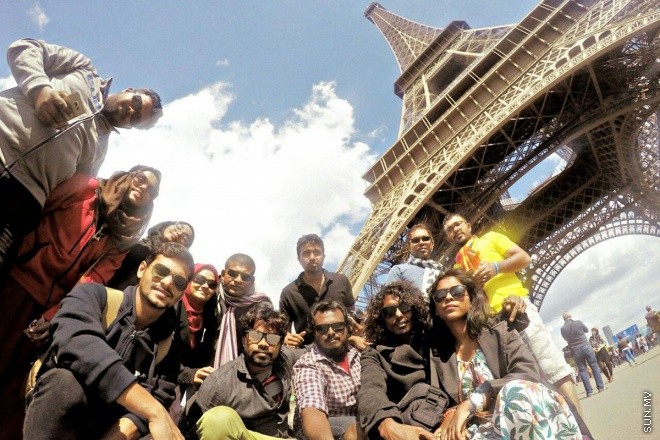 ކޮކާކޯލާ ޔޫރޯ 2016 ޕްރޮމޯޝަންގެ ނަސީބުވެރީން، ނަސީބުވެރީން ޕެރިހުގެ އައިފަލް ޓަވަރުގެ އެންމެ މަތީގައި ފޮޓޯއަކަށް ހުއްޓިލައިގެން -- ސަން ފޮޓޯ: ޠަލްޙަތު މޫސާ