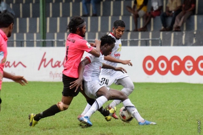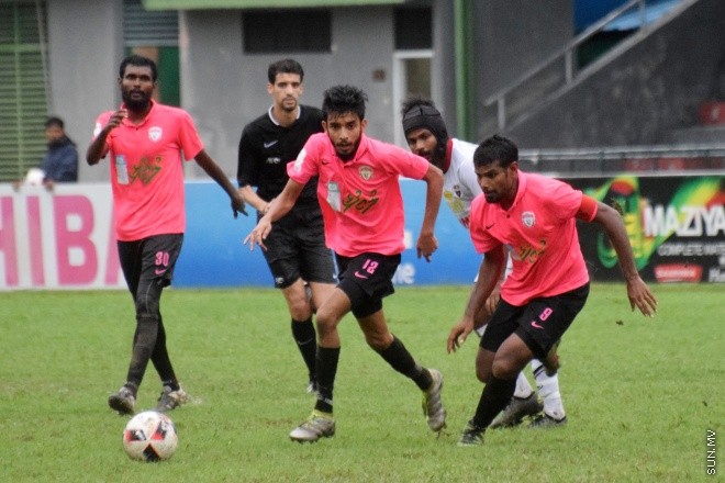 އުރީދޫ ދިވެހި ޕްރިމިއާ ލީގުގެ ދެވަނަ ބުރުގައި ޔުނައިޓެޑް ވިކްޓަރީ އާއި ޓީސީ ސްޕޯޓްސް ކްލަބު ބައްދަލުކުރި މެޗުގެ ތެރެއިން: އެ މެޗު 1-0 ލަނޑުން ކާމިޔާބުކުރީ ޔުނައިޓެޑް ވިކްޓަރީ --- ސަން ފޮޓޯ/ ފަޔާޒް މޫސާ