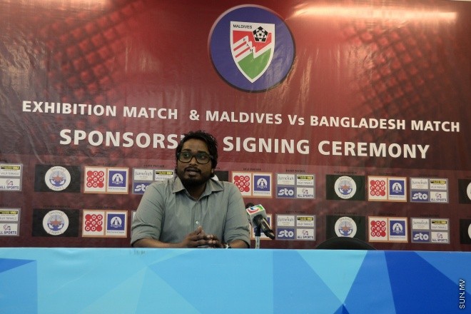 ގައުމީ ޓީމު ކުޅޭ އެކުވެރިކަމުގެ ދެ މެޗުގެ ޕާޓްނަރުންނާއެކު އެއްބަސްވުމުގައި ސޮއިކުރުމަށް ބޭއްވި ރަސްމިއްޔާތަށްފަހު އެފްއޭއެމްގެ ޖެނެރަލް ސެކްރެޓަރީ ބައްސާމް އަދީލް ޖަލީލް ވާހަކަދައްވަނީ --- ސަން ފޮޓޯ/ މުހައްމަދު އަފްރާހް