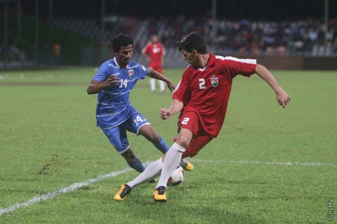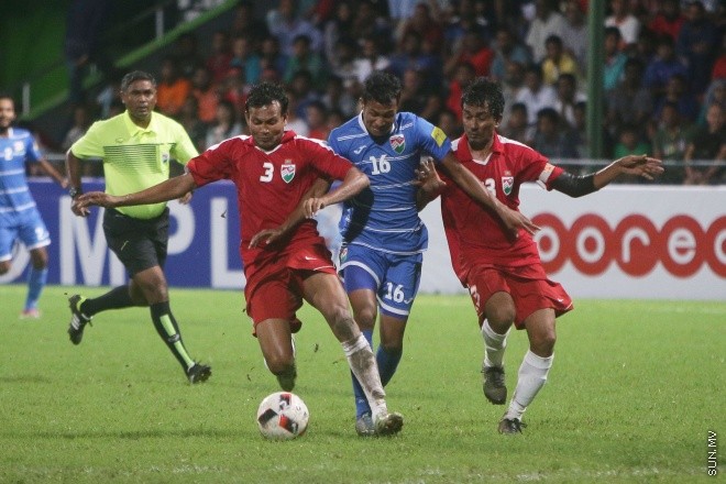 ރާއްޖޭގެ މިހާރުގެ ގައުމީ ޓީމާއި ސާފް ޗެމްޕިއަން 2008 ކާމިޔާބުކުރި ޓީމު ބައްދަލުކުރި މެޗުގެ ތެރެއިން: އެ މެޗުން މިހާރުގެ ގައުމީ ޓީމު މޮޅުވެފައިވަނީ 1-0 ލަނޑުން --- ސަން ފޮޓޯ: ފަޔާޒް މޫސާ