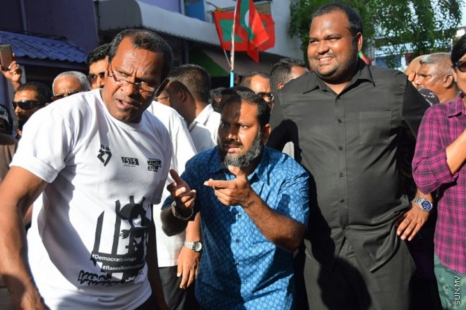 އަދާލަތުޕާޓީގެ ރައީސް ޝެއިޚް އިމްރާނާއި އެމްޑީޕީގެ ޗެއާ ޕާސަން އަލީ ވަހީދާއި މަޖިލިސް މެމްބަރު ފަލާހު، މޭޑޭ މުޒާހަރާގެ ތެރެއިން -- ސަން ފައިލް ފޮޓޯ
