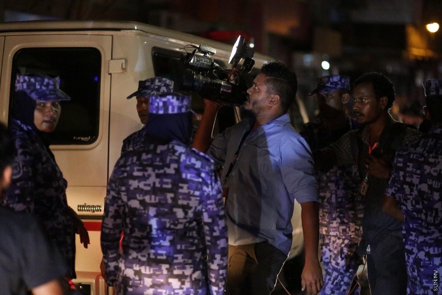 ޕޭވްމަންޓު މަތީގައި މަޑުކޮށްގެން ތިއްބައި ހަތަރު ކެމެރާމަނުން ފުލުހުންގެ ވެހިކަލަކަށް އަރުވައިގެން ގެންދިޔައިރު، އެހެން ނޫސްވެރިން ވެސް އެ މީހުންނާއެކު ސަރަހައްދުގައި ތިއްބެވެ. ކެމެރާމަނުން ފުލުހުން ގެންދިޔަ ވަގުތަކީ މުޒާހަރާގައި ހަމަނުޖެހުމެއް ހިނގަމުންދިޔަ ވަގުތެއް ނޫނެވެ.
