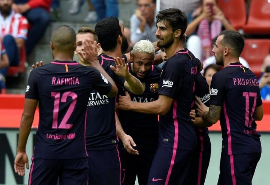ސްޕެނިޝް ލަލީގާގައި ސްޕޯޓިން ގިޔޮން ކޮޅަށް ނޭމާ ކާމިޔާބުކުރި ލަނޑަކަށް ފަހު ބާސާގެ ކުޅުންތެރިން އުފާފާޅުކުރަނީ: އެ މެޗުން ބާސާ މޮޅުވެފައިވަނީ 5-0 ލަނޑުން --- ފޮޓޯ: ރޮއިޓާސް