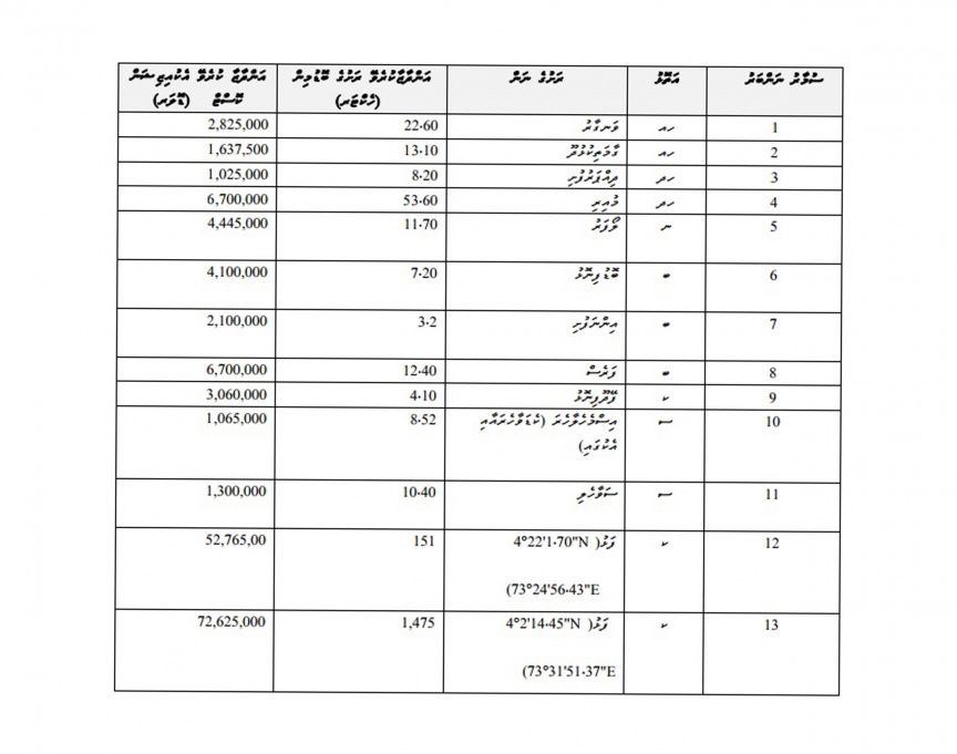 ފަތުރުވެރިކަމާ ބެހޭ ކަންކަމަށް ދޫކުރާނެ ރަށްރަށާއި ފަޅުތަކުގެ އަދަދާއި އެތަންތަނާ ބެހޭ މަޢުލޫމާތު ހިމެނޭ ގޮތަށް ނެރުނު އެ ލިސްޓުގައި ޖުމަލް 13 ރަށެއް ހިމެނެ އެވެ.