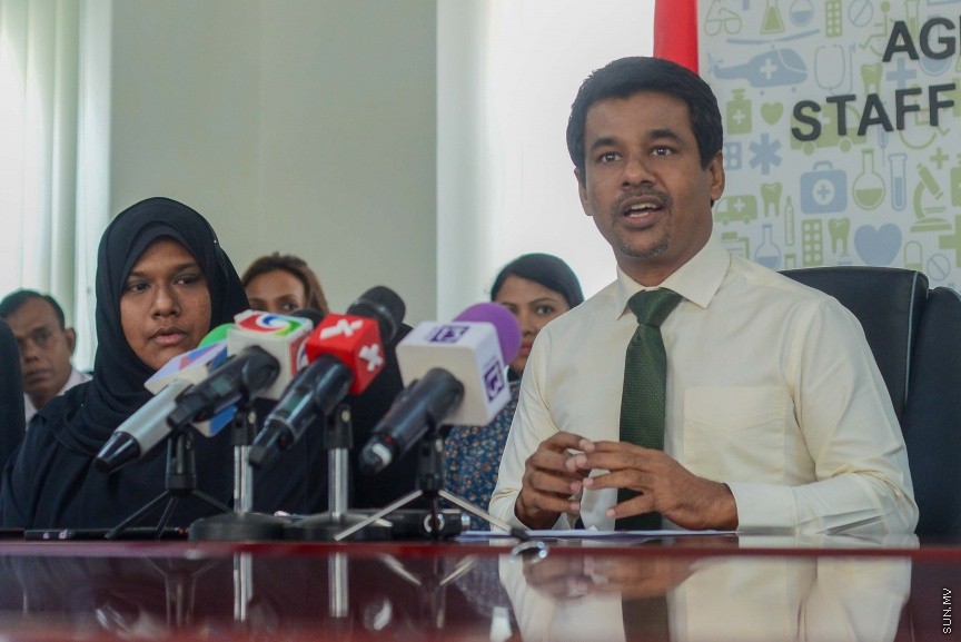 ޚާއްސަ އެހީއަށް ބޭނުންވާ މަރުކަަޒަށް ސްޕޮންސާގެ އެހީގައި މުވައްޒަފުން ހަމަޖެއްސުމާއިބެހޭ އެއްބަސްވުންތަކުގައި ސޮއި ކުރުމަށް ބޭއްވި ރަސްމިއްޔާތުގައި މިނިސްޓަރު ވާހަކަފުޅު ދައްކަވަނީ --- ސަން ފޮޓޯ/ މުހައްމަދު އަފްރާހް