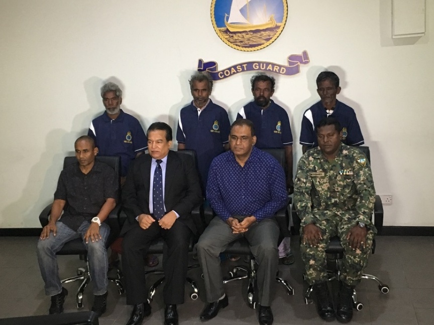 ލަންކާ މަސްވެރިން އެ ގައުމުގެ އޮފިޝަލުންނާ އެކު ކޯސްޓްގާޑް ބިލްޑިންގައި: އެމީހުން ލަންކާއަށް ފޮނުވުމުގެ މަސައްކަތް ދަނީ ކުރަމުން - ސަން ފޮޓޯ/ ފަތުހުﷲ ޔާމީން ސައީދު