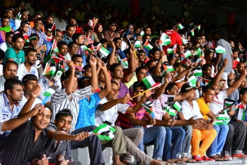 ރާއްޖޭގައި ބޭއްވި އޭއެފްސީ ޗެލެންޖް ކަޕް 2014ގެ ފައިނަލް މެޗުގައި ރާއްޖޭގެ ގިނަ އަދަދެއްގެ ސަޕޯޓަރުން ފަލަސްތީނަށް ތަރުހީބުދެނީ --- ސަން ފައިލް ފޮޓޯ