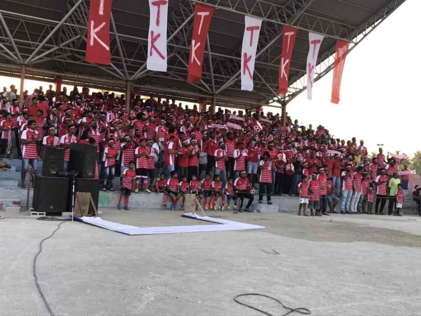 ކުޅުދުއްފުށީ ޓީމުގެ ބައެއް ސަޕޯޓަރުން: މިނިވަން ޗެމްޕިއަންޝިޕް 2017ގެ ފުރަތަމަ މެޗުގައި ކުރިނބީގެ މައްޗަށް ކުޅުދުއްފުށިން ކުރި ހޯދާފައިވަނީ 4-2 ލަނޑުން --- ފޮޓޯ/ އެފްއޭއެމް