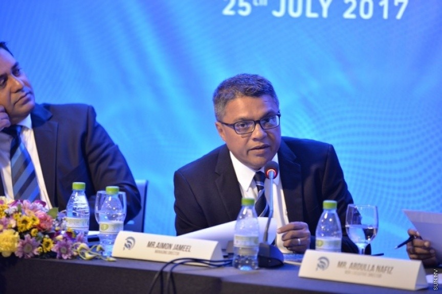 ސެންޗޫރިއަން ޕލކގެ ފުރަތަމަ އަހަރީ އާންމު ޖަލްސާގައި ކުންފުނީގެ މެނޭޖިންގް ޑިރެކްޓަރު އައިމަން ޖަމީލް -- ސަން ފޮޓޯ/ ފަޔާޒު މޫސާ
