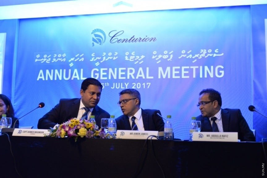 ސެންޗޫރިއަން ޕލކގެ ފުރަތަމަ އަހަރީ އާންމު ޖަލްސާގައި ކުންފުނީގެ މެނޭޖިންގް ޑިރެކްޓަރާއި ޗެއާމަން -- ސަން ފޮޓޯ/ ފަޔާޒު މޫސާ