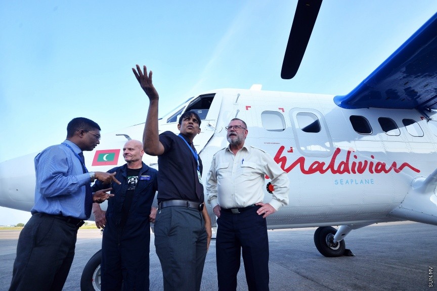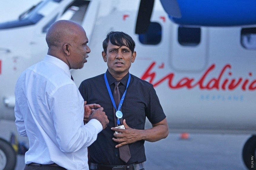 މިއަދު ހަވީރު ރާއްޖެ ގެނައި އައު ސީޕްލޭން ކައިރީގައި އައިލެންޑް އޭވިއޭޝަންގެ މެނޭޖިން ޑިރެކްޓަރު ހާރިސް -- ސަން ފޮޓޯ/ ފަޔާޒު މޫސާ