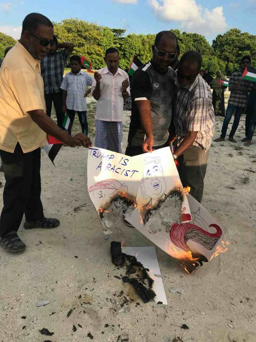 ޓްރަމްޕުގެ ނިންމުމާ ދެކޮޅަށް ހުޅުދުއްފާރުގައި ކުރި އިހްތިޖާޖުގެ ތެރެއިން -- ފޮޓޯ/ ހުޅުދުއްފާރު ކައުންސިލް