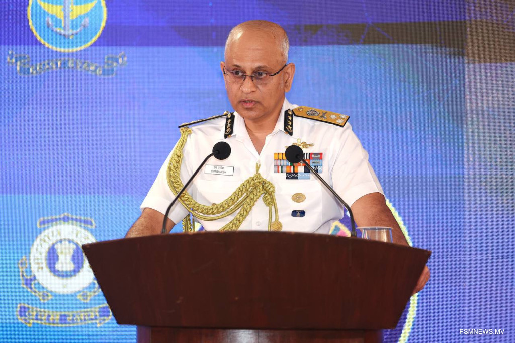 އިންޑިއާ ކޯސްޓް ގާޑުގެ ޑިރެކްޓަރ ޖެނެރަލް އެޑްމިރަލް ހަރްމޭޝް ޝްރްމާނީ "ދޯސްތީ" ތަމްރީނުތަކުގެ 17 ވަނަ އެޑިޝަން ރަސްމީކޮށް އިފްތިތާޙުކުރުމަށް ބޭއްވި ރަސްމިއްޔާތުގައި ވާހަކަ ދައްކަވަނީ/ ފޮޓޯ ޕީއެެސްއެމް