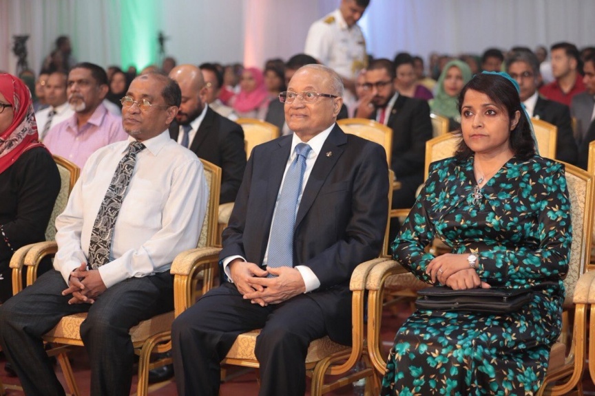 އިންޑިއާގެ 69 ވަނަ ޖުމްހޫރީ ދުވަހާ ގުޅިގެން ރާއްޖޭގައި ހުންނަ އިންޑިއާގެ އެމްބަސީ އިން ރޭ ބޭއްވި ހަފްލާގައި ކުރީގެ ރައީސް މައުމޫނާއި ޔުމްނާ މައުމޫން --- ފޮޓޯ: ހެލްތް މިނިސްޓްރީ / ޓްވިޓާ