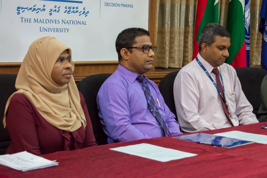 ދިވެހިބަހާއި ތާރީޚާ ގުޅޭ ފޮތްތައް އެކަޑަމީއިން ގައުމީ ޔުނިވާސިޓީއަށް ފޯރުކޮށްދިނުމާ ބެހޭ ފަހުމުނާމާގައި ސޮއިކުރުމަށް ބޭއްވި ރަސްމިއްޔާތުގެ ތެރެއިން-- ފޮޓޯ: ގައުމީ ޔުނިވާސިޓީ