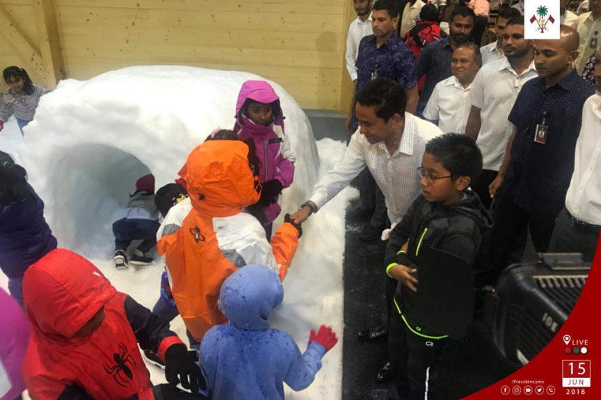 #Live#PresYameenand First Lady meet with the children enjoying the various activities at the first winter theme park in the#Maldives. The park includes an Olympic grade ice skating rink and snow slide.pic.twitter.com/BvxtLoN7or