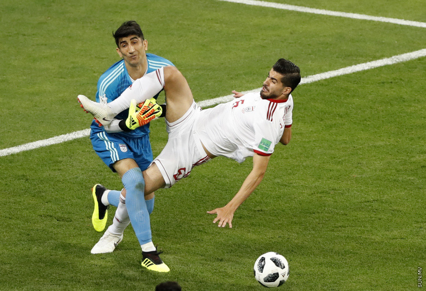 ވޯލްޑް ކަޕް 2018ގައި ޕޯޗުގަލްއާ ދެކޮޅަށް ކުޅުނު މެޗުގައި ބޯޅަ ހޯދުމަށް އީރާންގެ ކީޕަރު ބީރާންފާންދް މަސައްކަތްކުރަނީ --- ފޮޓޯ/ އޭޕީ