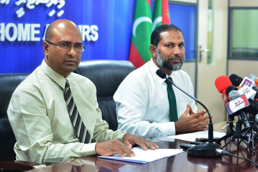 ހޯމް މިނިސްޓްރީއާއި ކަރެކްޝަން ސާވިސް އިން މިއަދު ބޭއްވި ނޫސްވެރިންގެ ބައްދަލުވުމުގައި މިނިސްޓަރު އައްޝައިހް އިމްރާން އަބްދުﷲ ވާހަކަ ދައްކަވަނީ -- ސަން ފޮޓޯ/ އަހްމަދު އަވްޝަން އިލްޔާސް