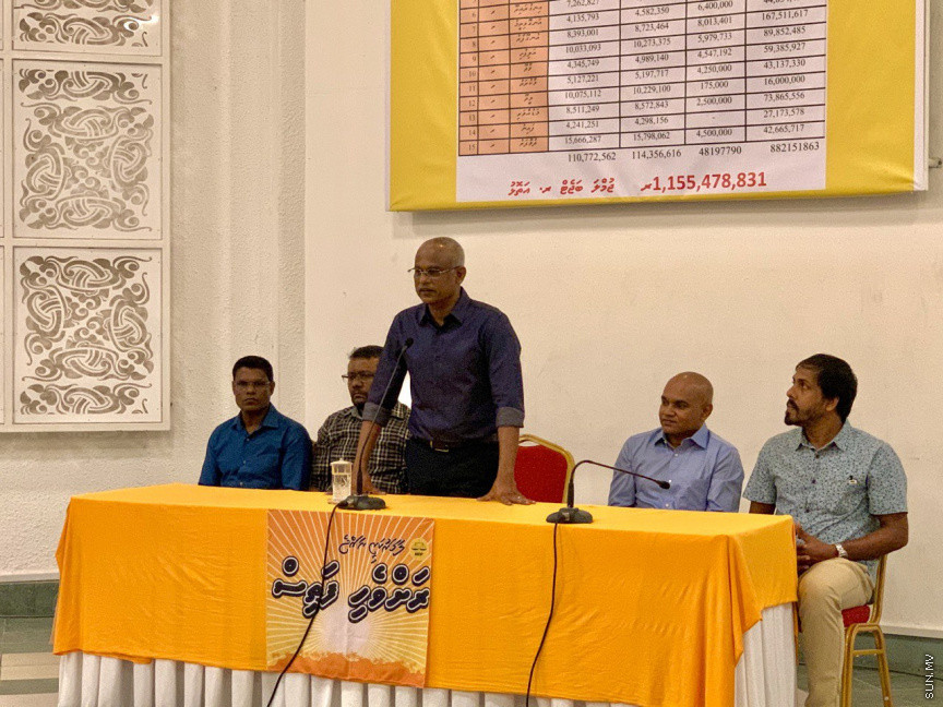 "ދައުލަތުގެ ހަރަދުތައްވެސް ކުޑަ މިދަނީ ކުރަމުން. އެހެން ނަމަވެސް އަޅުގަނޑުމެން މަސައްކަތް ކުރަމުން މިދަނީ، ރަށްރަށުގެ ތަރައްގީއަށްޓަކައި މިއަހަރު ޕްލޭން ކުރެވިފައި ހުރި އެއްވެސް މަސައްކަތެއް ފަސްޖައްސާނުލާ ކުރިއަށް ދިޔުން. އުންމީދަކީވެސް އެއީ،" ރައީސް ސޯލިހް ވިދާޅުވިއެވެ.
