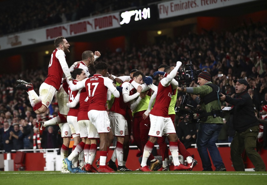 އިނގިރޭސި ޕްރިމިއާ ލީގުގައި ލިވަޕޫލަށް ކޮޅަށް ލަނޑެއް ޖެހުމަށްފަހު އާސެނަލްގެ ކުޅުންތެރިން އުފާފާޅުކުރަނީ --- ފޮޓޯ/ އޭޕީ