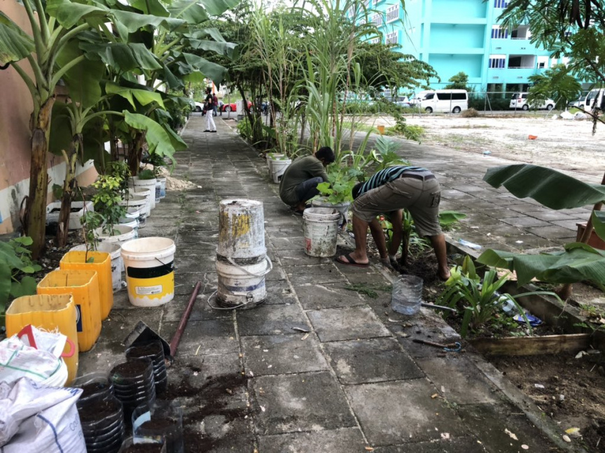 ހުޅުމާލޭގެ ފްލެޓުތަކުގެ ގްރައުންޑް ފްލޯގައި އުޅޭ ރައްޔިތުން، މަގުމައްޗާ ވީ ސަރަހައްދުގައިވެސް ގަސް ހައްދައި، އިންދާފައި ހުރެ އެވެ.