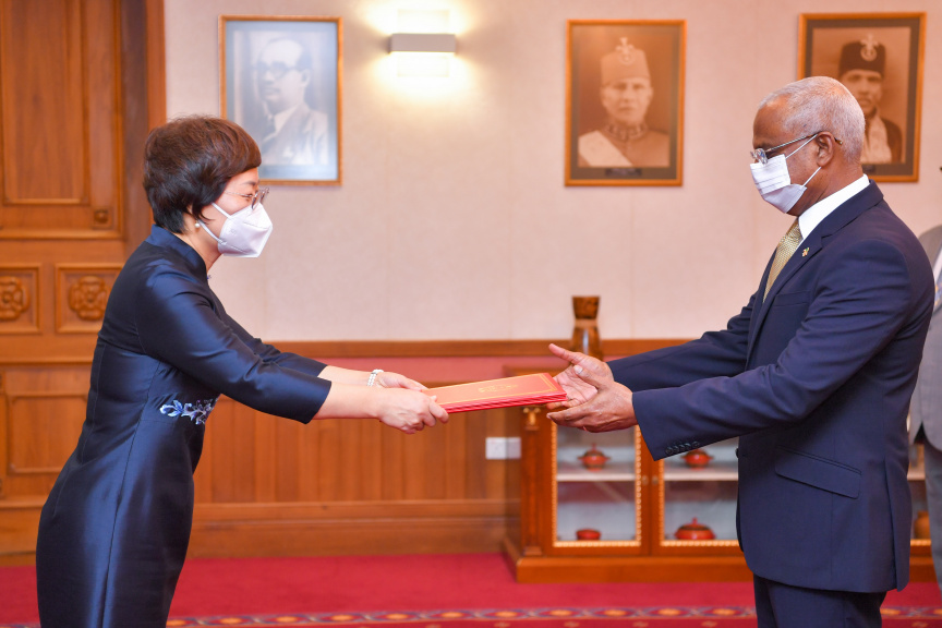 ސެޕްޓެމްބަރު 6، 2021: ޗައިނާއިން ރާއްޖެއަށް ކަނޑައެޅުއްވި އާ ސަފީރު ވާން ލިޖިން އޭނާގެ ސަފީރުކަމުގެ ފަތްކޮޅު ރައީސުލްޖުމްހޫރިއްޔާ އިބްރާހިމް މުހައްމަދު ސޯލިހަށް އެރުވުން -- ފޮޓޯ/ ރައީސް އޮފީސް