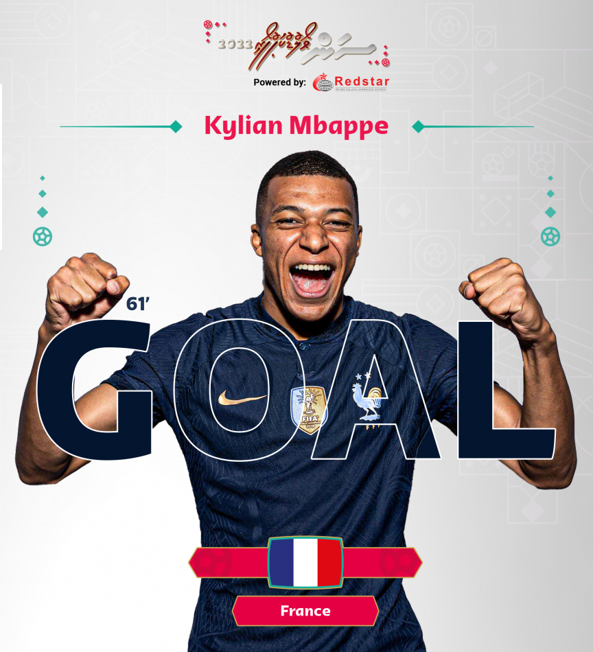 61 ވަނަ މިނެޓު: ފްރާންސް އިން ލަނޑެއް ޖަހައި ލީޑު ނަގައިފި. މިލަނޑު އެޓީމަށް ކާމިޔާބު ކޮށްދިނީ ޒުވާން ތަރި ކިލިއަން އެމްބާޕޭ. މިއީ ތިއޯ ހެނާންޑޭޒް އާއި އެމްބާޕޭއާ ދެ ކުޅުންތެރިން ގުޅިގެން ތަނަވަސްކުރި ފުރުސަތަކުން އެމްބާޕޭ ކާމިޔާބު ކުރި ލަނޑެއް.