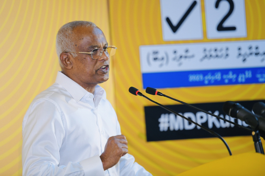 4 ޖެނުއަރީ 2023: ރައީސް އިބްރާހީމް މުހައްމަދު ޞާލިހު އެ މަނިކުފާނުގެ ކެމްޕެއިން ޖަލްސާގައި ވަހަކަފުޅުދައްކަވަނީ -- ސަން ފޮޓޯ/ ނާއިލް ހުސައިން