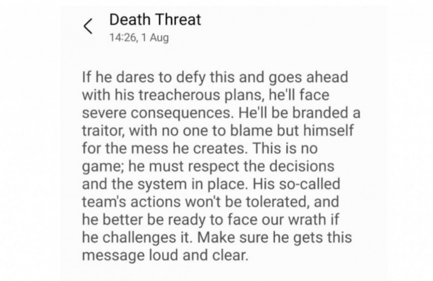 އޭނާއަށް އިންޒާރު ދީ ފޮނުފައިވާ މެސެޖުތަކުގައި ވަނީ މުއިއްޒު ޔާމީންގެ ނިންމެވުން ބަދަލު ކުރަން މަސައްކަތް ކުރާ ކަމަށް ތުހުމަތު ކޮށްފައެވެ. އަދި، އެގޮތަށް ކަންތައް ކޮށްފިނަމަ ބޮޑެތި ކަންތައްތަކާ ކުރިމަތިލާން ޖެހޭނެ ކަމަށް ބުނެ ވަނީ އިންޒާރު ދީފައެވެ.