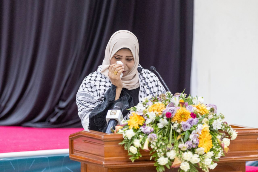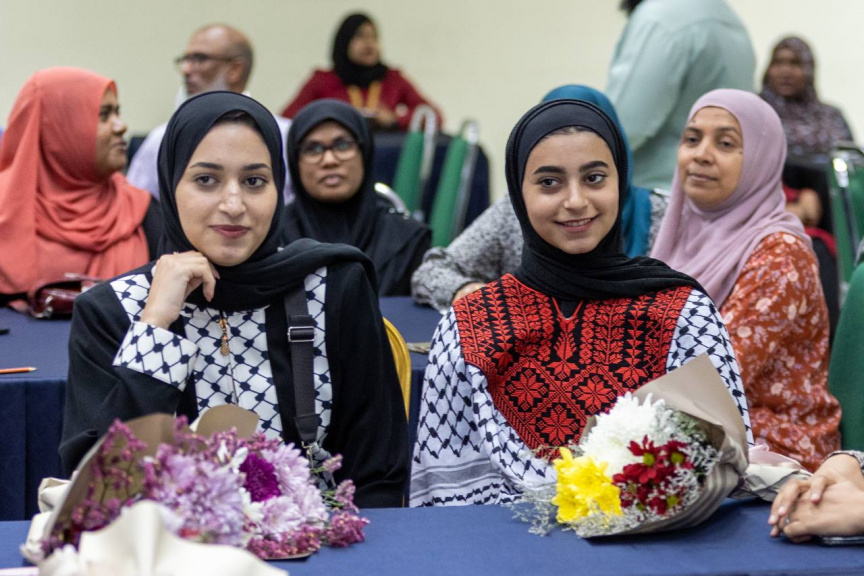 އައިޔޫއެމްގެ ޕްރޮފެސަރެއްގެ ގޮތުގައި މަސައްކަތްކުރާ ފަލަސްތީނުގެ ރައްޔިތެއް ކަމަށްވާ ޑރ. ހަސަން އަލް ކުރްދީގެ އާއިލާއަށް މަރުޙަބާ ކިޔުމަށް ބޭއްވި ހަފުލާ: ކުރުދީގެ އަންހެނުން ވަނީ އެ މީހުން ތަހައްމަލުކުރި ވޭން ކިޔައިދީފައި -- ސަން ފޮޓޯ/ މޫސާ ނަދީމް