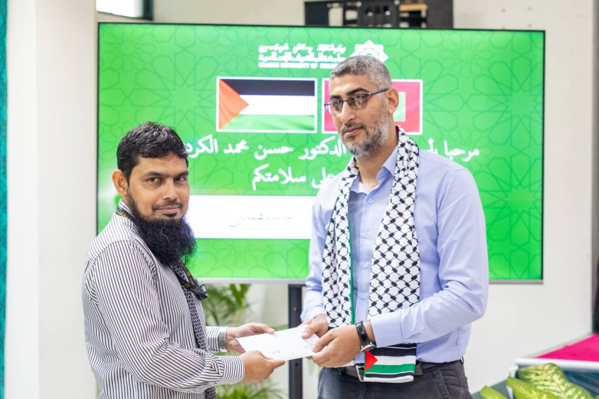 އައިޔޫއެމްގެ ޕްރޮފެސަރެއްގެ ގޮތުގައި މަސައްކަތްކުރާ ފަލަސްތީނުގެ ރައްޔިތެއް ކަމަށްވާ ޑރ. ހަސަން އަލް ކުރްދީގެ އާއިލާއަށް މަރުޙަބާ ކިޔުމަށް ބޭއްވި ހަފުލާ: އައިޔޫއެމްއިން އެ އާއިލާއަށް ފަންޑް ޑޮނޭޝަން ހަދިޔާކުރުން -- ސަން ފޮޓޯ/ މޫސާ ނަދީމް