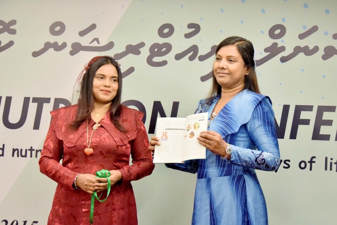 މިއަދު ހޮޓެލް ޖެން ގައި ބޭއްވި "ނޭޝަނަލް ނިއުޓްރީޝަން ކޮންފަރެންސް 2015"ގެ ހުޅުވުމުގެ ރަސްމިއްޔާތުގެ ތެރެއިން: މެޓާނަލް އަދި ޗައިލްޑް ނިއުޓްރީޝަން ގައިޑެއް އެޑިއުކޭޝަން މިނިސްޓަރު ލޯންޗު ކޮށްދެއްވަނީ--- ސަން ފޮޓޯ: އަލީ ނަސީރު