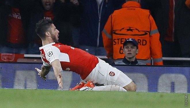 ރޭގެ މެޗްގައި ޖިރޯޑް އާސެނަލްގެ ފުރަތަމަ ގޯލް ޖެހުމަށް ފަހު އުފާ ފާޅުކުރަނީ --- ފޮޓޯ: އޭޕީ