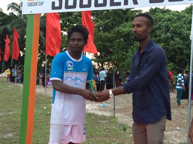 ސިޔާމް މައުރޫފް ސޮކާ އިއްޔެ ހަވީރު ހެނބަދޫއާ މަނަދޫ ކުޅުނު މެޗްގެ މޮޅު ކުޅުންތެރިއާގެ މަގާމު ހޯދި އިބްރާހިމް ނައުފަލް އަށް ޓްރޮފީ ހަވާލު ކޮށްދެއްވަނީ --- ފޮޓޯ: ހަފްސީ އަބްދުﷲ