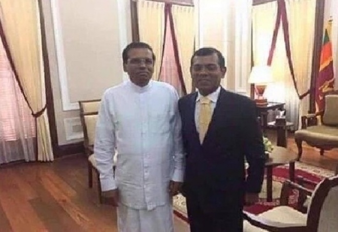 ސްރީ ލަންކާގެ ރައީސް މައިތުރިޕާލަ ސިރިސޭނާ، މިދިޔަ ހޯމަ ދުވަހުގެ ރޭ ކުރީގެ ރައީސް މުހައްމަދު ނަޝީދާ ބައްދަލުކުރެއްވި ކަމަށް ބުނެ، ސޯޝަލް މީޑިއާގައި އާންމުކުރި ފޮޓޯ. މިއީ ސިރިސޭނާ އިންތިޚާބު ކާމިޔާބުކުރެއްވުމާ ގުޅިގެން 2015 ވަނަ އަހަރު، ރައީސް ނަޝީދު ކުރެއްވި ޒިޔާރަތެއްގައި ނަންގަވާފައިވާ ފޮޓޯއެއް --